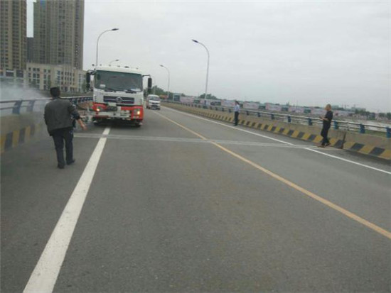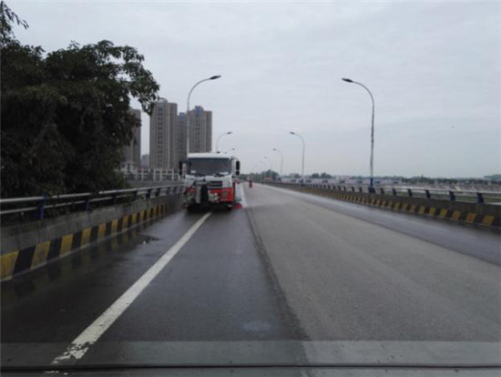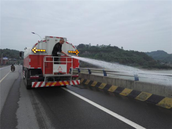 洒水车冲洗岷江一桥护栏和扫地车桥面清扫
