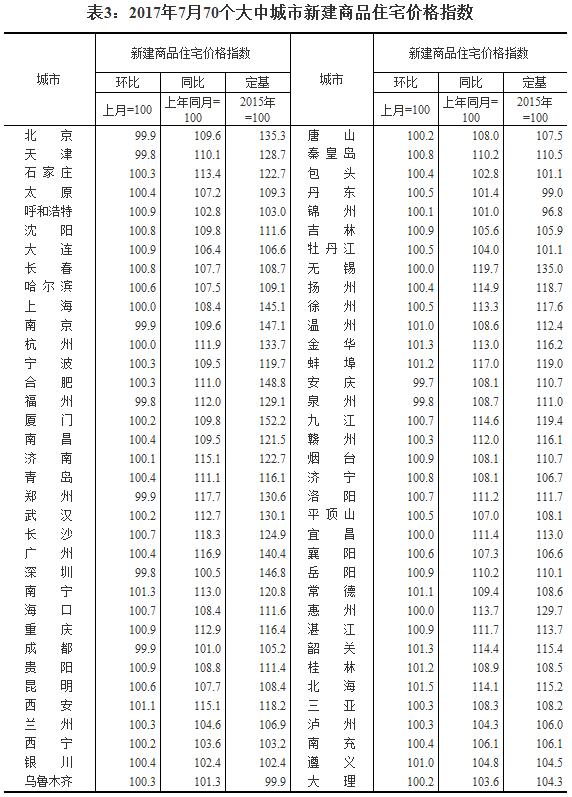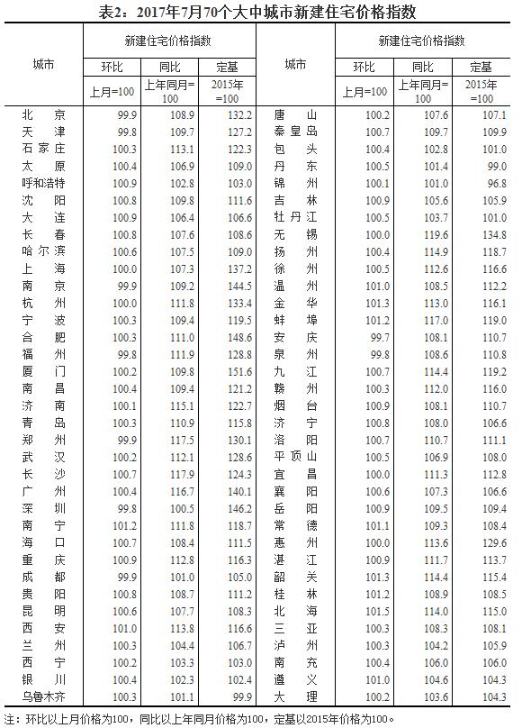 2017年7月份70个大中城市住宅销售价格变动情况如下: