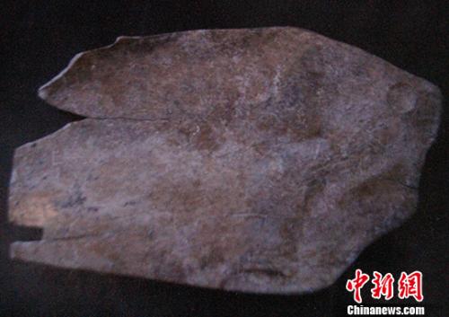 图为11日拍摄的甲骨文,一块牛的肩胛骨,长约15厘米,宽约10厘米,表面较为光滑,琢磨成骨铲的样子。 中新社记者 冽玮 摄