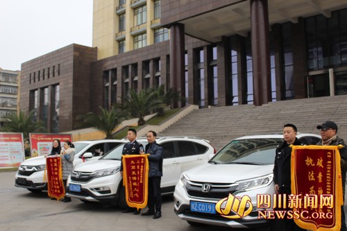 四川新闻网眉山1月5日讯(邱毅 摄影报道) 近日,眉山中心城区三辆白色CRV越野车同时被盗, 经过眉山市东坡公安分局干警连夜作战,被盗车辆全部追回。今(5)日上午,在东坡公安分局将被盗车辆交还失主。