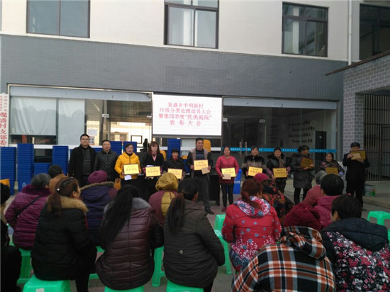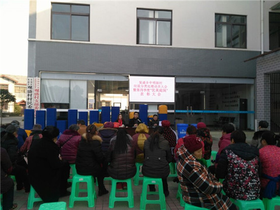 四川新闻网眉山1月11日讯(姜瑞鑫 文/图) 近日,东坡区复盛乡在观盛中明新村召开了可回收垃圾分类处理动员大会暨第四季度优美庭院表彰大会。会上,乡党委书记、乡分管领导、观盛村全体村组干部、党员和中明新村住户共100余人参会。会上宣传了复盛乡中明新村环境治理的方式方法。