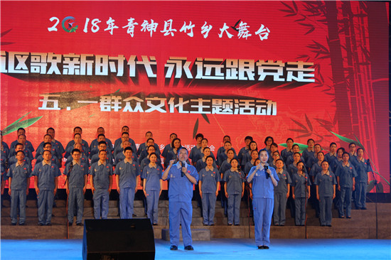 表彰会后,拉开了2018年青神县竹乡大舞台“讴歌新时代 永远跟党走”五一群众文化主题活动歌咏比赛。参赛的9支代表队分别来自县教育系统、立白集团、县直机关、卫计系统、政法系统、住建系统以及全县各乡镇的组合代表队。一曲曲歌颂党、歌颂祖国、歌唱劳动者的曲目陆续登场。绚烂的舞台,美妙的舞姿,嘹亮的歌声,铿锵的朗诵,展现了青神儿女用勤劳的双手建设美丽家乡和新时代奋发有为的精神风貌,整场晚会赢得观众阵阵掌声。
