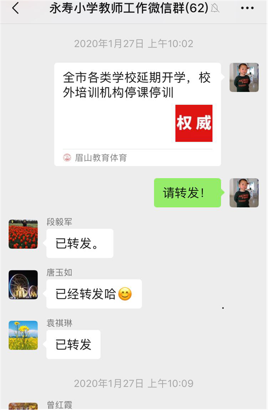 各班主任老师通过班级QQ群、微信群向全体学生及家长发放了《永寿小学防疫工作告师生家长书》,向学生及家长传递家庭防疫知识,安抚学生不安情绪等。