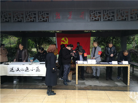 4月3日,天空下着蒙蒙细雨,丹棱大雅城小区门口,一群戴着红袖标的人正在有条不紊地忙碌着,搭桌子、摆笔砚、放书籍。他们是该小区“包保”单位党支部的成员,在清明节前夕,开展“送文化进小区”活动。