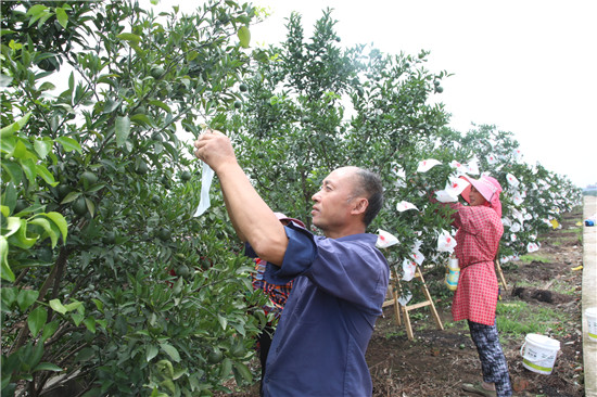 7月6日,位于彭山区公义镇原马林村(今公义场社区)7组的天兴农业有限公司160余亩的家庭农场内,58岁的郭友谊正忙着组织周边村民给柑橘套袋。“今天一共组织了70多名村民来套袋,计划一周之内完成。”