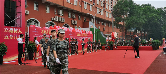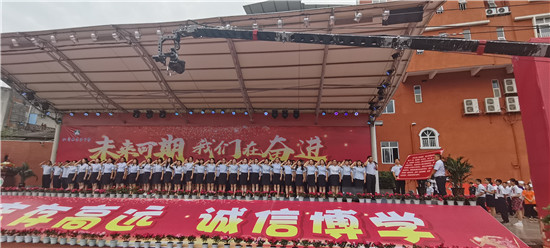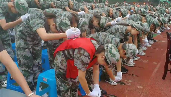 当天,其实是该校的开学典礼,入学仪式开始后,初一、高一新生踏上“求学路”,穿过“时光壁”,跨进“兴华门”,擂鼓明志后,学生们按照口令向台下就坐的老师行拜师礼,全体老师也鞠躬回礼。