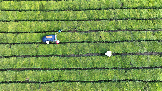 绿浪翻滚的茶树丛中,采茶机在茶农的操作下,灵活穿梭于茶园里,短短几分钟,所到之处的鲜叶便顺着气流“钻”进收集袋。