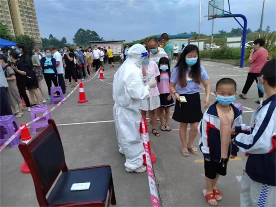 “请大家戴好口罩,保持一米以上距离,提前打开天府健康通。”兴盛卫生院便民核酸采样现场,采样群众在工作人员和志愿者的引导下有序排队进场进行核酸采样。现场除了“天使白”“志愿红”,还有一群返乡学生志愿者四处奔走,维持秩序、协助扫码、数据核实等忙得大汗淋漓。