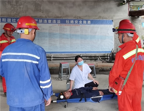 演练模拟矿区井下发生事故,一名工人受伤。矿区井下当班副矿长同施工队队长,在检查作业点时发现了事故情况,立即打电话向矿长汇报,矿长随即组织人员并向上级汇报事故情况。矿领导立即下达命令启动预案并成立应急救援指挥部,并任命矿长任应急救援现场总指挥。按照应急指挥部指令,相关人员立即进入应急救援状态,各救援组先后到达救援现场,在勘查现场、做好警戒、疏散人员的同时进行应急救援。