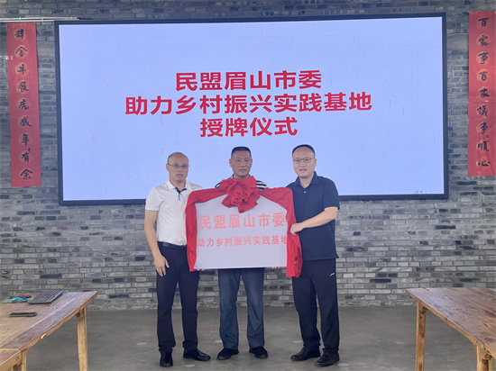 民盟眉山市委主委、市现代服务业促进中心主任王进儒、民盟眉山市委专职副主委兼秘书长任学东、青神县高台镇镇长徐俊出席仪式并为民盟乡村振兴实践基地揭牌。