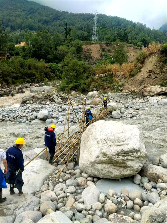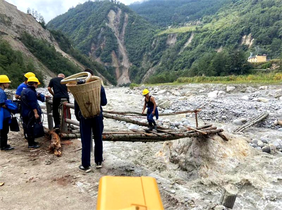 眉山水利救援队伍于7日19时抵达震中磨西镇。在四川省农村水利中心统一调度指挥下,分两小队徒步前往青岗坪、蔡阳村安置点。