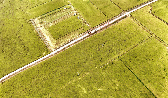 一排排适合当地耕作的小型收割机正开足马力,来来回回,收割、扬尘、脱粒,一气呵成。一辆辆农用三轮车往返稻田和烘干车间,将新收的稻谷烘干、打包,送往加工厂。当地群众敲响了节日的锣鼓,载歌载舞,庆祝丰收。田间地头,农家小院,到处洋溢着丰收的欢乐与喜庆。