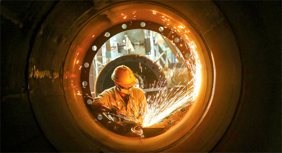 | 眉山天府新区中建钢构(四川)有限公司生产车间内,工人在忙碌焊接加工零部件,赶制订单。张忠苹摄 |