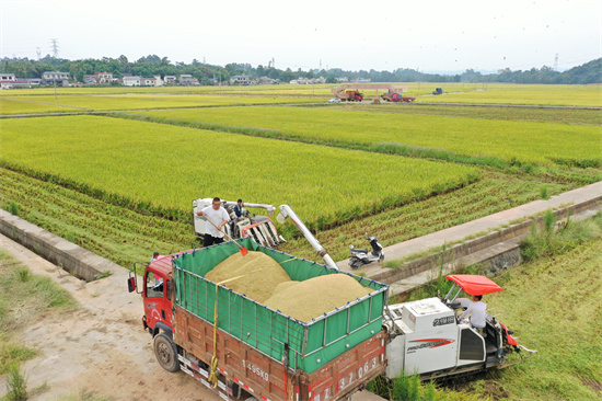 | 在眉山市青神县西龙镇光辉村,村民操作机械在去年底将“草坪田”“还粮”后的稻田里收割水稻。姚永亮 摄 |