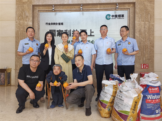 2021年杜仕杰(第一排中)和侄女杜叶(第二排左三)送自家果园橘子,东坡烟草“以购代扶”。胡佳摄