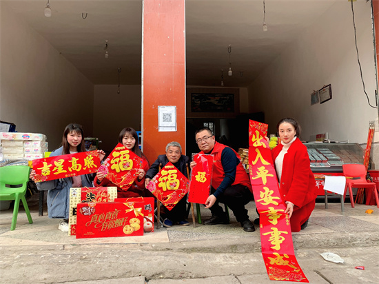烟草志愿者为杜仕杰(左三)送新春祝福。刘巍摄