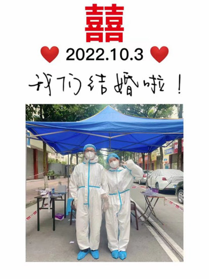 上午11点40分,在核酸采样工作结束后,两人终于有时间记录一下这个特殊的日子。他们选择在朋友圈发了一张“我们结婚啦”的合照,并配文“特别的爱”。一手挽着站得笔直的文林,唐娇笑靥如花。很快,两人便收到了朋友圈满满的祝福。