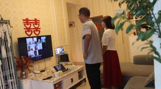 在朋友的主持下,两人端端正正地站在电视机前,接受着家人和朋友们的真诚祝福。鞠躬,感谢爸妈,一杯交杯酒,双方交换戒指,一个简单的仪式便算礼成……