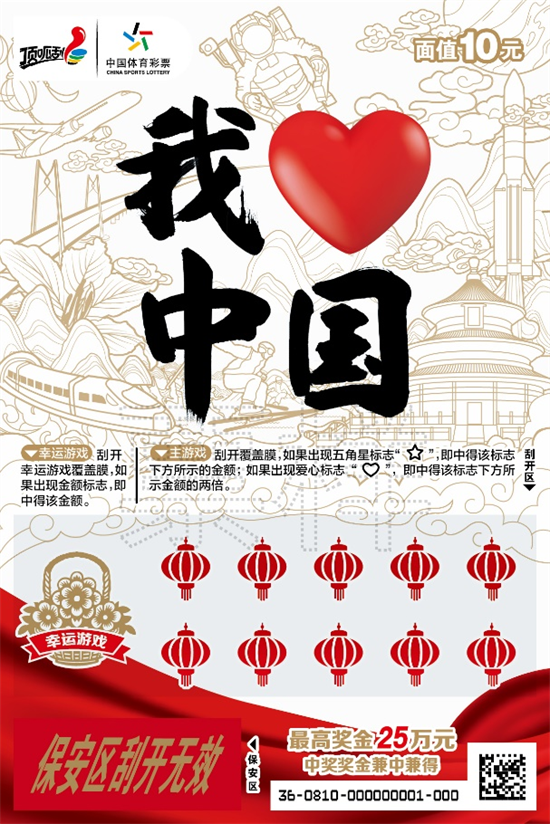 面值10元的“我爱中国”即开票最高奖金25万元,游戏玩法以找奖金符号和找中奖符号为主,分为幸运游戏和主游戏,提升购彩者的中奖体验,享受双重惊喜幸运。