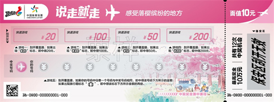 “说走就走”面值10元,共有12次中奖机会。最高奖金10万元。