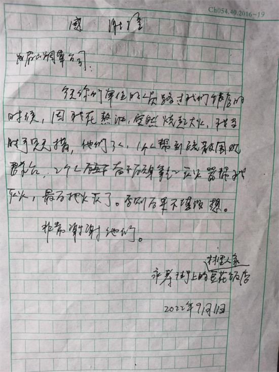 “烟草公司的人员太专业了,拿起灭火器和湿毛巾就把火扑灭了!”街上的群众连连叫好。临走之际,饭店老板周春勇还趁机送上了一封临时手写的感谢信,称赞烟草人员的专业和热心。(供稿:眉山市烟草专卖局 陈荣海 刘景)