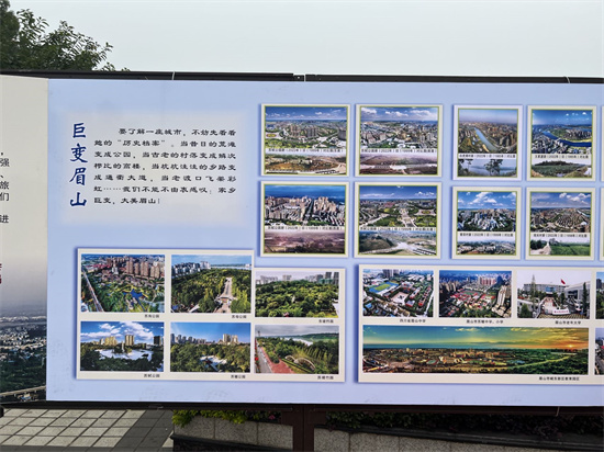 昔日的荒滩变成公园,古老的村落变成鳞次栉比的高楼,坑坑洼洼的乡路变成通衢大道,着重体现了眉山中心城区新旧面貌对比。