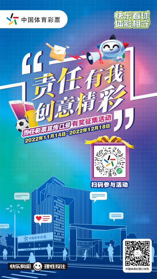不管你是兢兢业业的上班族还是退休赋闲在家的老大爷,只要你了解体彩,理解理性购彩真谛,就可以参与活动,用高妙的想法凝练成更加深入人心的响亮口号。一定要记住哟,本次活动将于11月14日至12月18日进行,参与者可通过“中国体育彩票”小程序、APP、微信号或者中国体彩网,点击责任彩票口号征集页面,完善个人信息后参与此次活动,也可以到附近实体店咨询相关信息,参与征集活动,将你的创意想法变现,领走属于你的体彩奖品!(供稿:四川体彩眉山分中心)