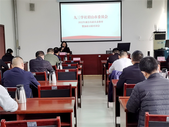 四川新闻网消息 11月22日, 九三学社眉山市委在中共眉山市委党校举办廉洁从政从业专题教育暨参政议政培训。会议由九三学社眉山市委专职副主委、秘书长曹水桂主持,九三学社四川省委参政议政处处长徐林林受邀出席会议,九三学社眉山市委副主委朱薇,社市委委员,社内市区(县)人大代表、政协委员,参政议政委成员,重点骨干社员,新发展社员等50余人参加培训。