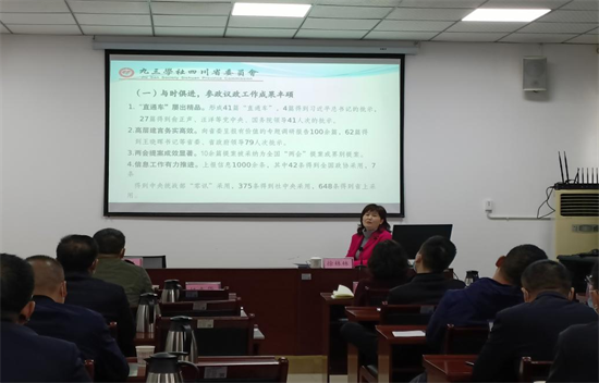 最后,徐林林结合自身工作实际,作题为《参政议政履职浅析》专题授课。重点从近五年九三学社四川省委参政议政工作所做的主要工作和取得的主要成效,参政议政工作的分类和报送渠道,以及如何写出高质量建言献策材料等三个方面,阐述了调研报告、议案提案、社情民意等的用途、撰写方式、建言重点、重点环节等,结合具体案例和实操进行了分享,内容丰富、操作性强。