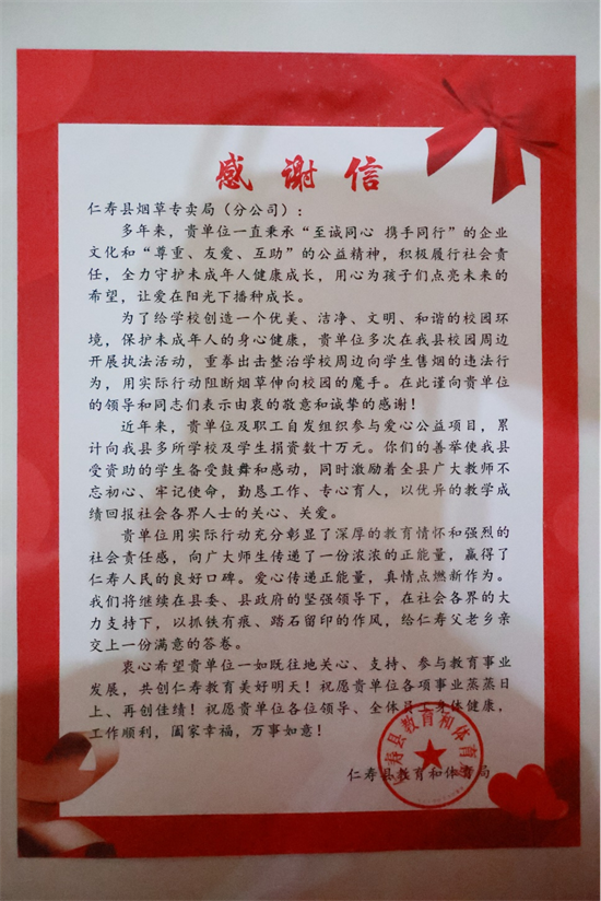 四川新闻网消息 12月28日,眉山市仁寿县教育局向仁寿县烟草专卖局(分公司)致感谢信,感谢仁寿烟草在涉烟普法、守护未成年和助力教育等方面作出的贡献。