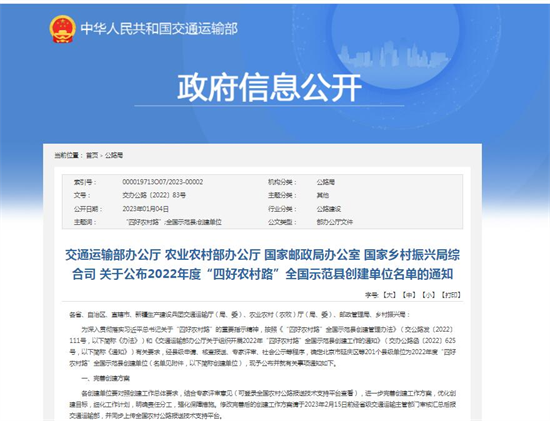 四川新闻网消息(钟书曼 李田) 2022年12月29日,交通运输部办公厅、农业农村部办公厅、国家邮政局办公室、国家乡村振兴局综合司公布2022年度“四好农村路”全国示范县创建单位名单,丹棱县成为眉山市唯一入选区县。