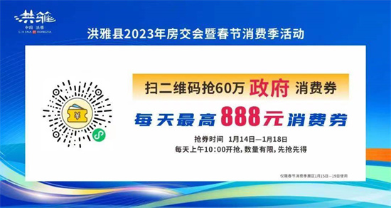 活动期间,由洪雅县政府财政补贴,发放60万元专场消费劵,扫码即可抢券。从2023年1月14日开始分5轮(1月14日至18日)投放,每天上午10:00开抢,数量有限,先抢先得,当天抢完则止,其中单张最高888元。现场洪雅特色商品、农产品、家电、百货等商家超30家,均可使用专场消费券。本次专场消费劵仅限在活动现场使用,使用时间2023年1月15日至19日。