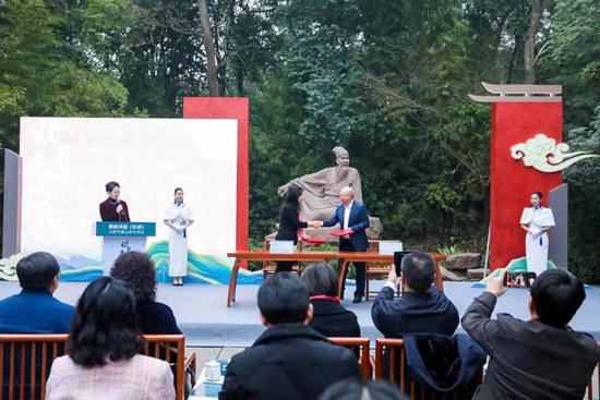 会上,中国东方演艺集团与眉山市歌舞剧院签署结对帮扶合作协议。(供图:眉山市委宣传部)