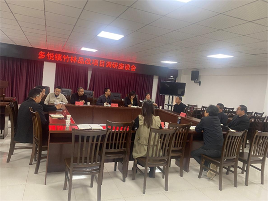 调研组一行在多悦镇召开座谈会。会上,多悦镇党委委员、副镇长周利向调研组汇报竹林品改项目建设的规划情况和主要存在的问题。市、区两级林业人员分别对该项目的建设背景、项目政策、两级政府重视度等进行详细宣讲和解读。“斑布一号”企业人员表示希望和多悦镇种植大户合作,并提出优惠的合作模式,消除种植大户的主要顾虑。