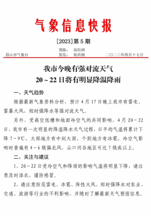 预计今晚眉山市将有雷电、雷暴大风、短时强降水等强对流天气;另外,受高空低槽和地面冷空气的共同影响,4月20~22日,眉山市还有一次明显的降温降水天气过程,日平均气温将累计下降7~9℃,大部地方有中到大雨,个别地方有冰雹,冷空气影响时普遍有4~6级偏北风,山口河谷地区可达7级或以上。