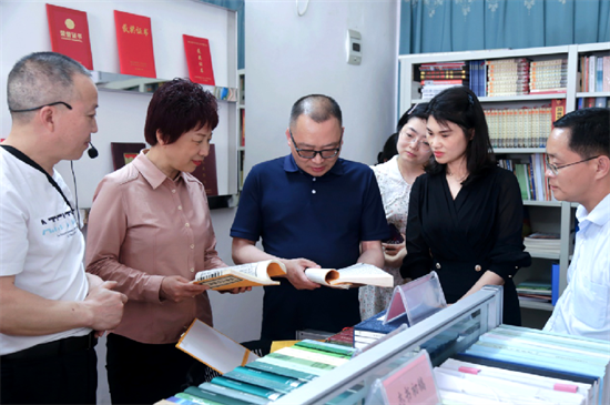 眉山市史志编纂中心主任黄劲松(中)翻阅大竹县乡镇(街道)志