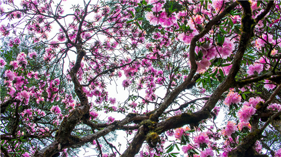 瓦屋山下的杜鹃花枝纤细,花朵娇小,当地俗称“映山红”。而高山杜鹃是一棵棵高大的树干,伸展出的树枝像一把撑开的大伞,硕大的花朵一簇簇一团团,竞相开放在瓦屋山巅,傲视群芳。