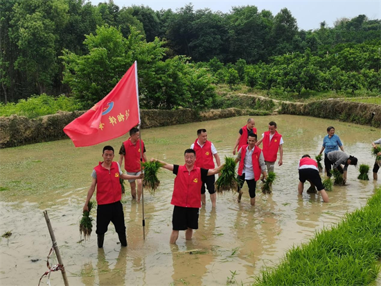 活动中,党员志愿者们身着红马甲,脱掉鞋袜,挽起裤腿,顶着烈日,在田间团结协作、抢插秧苗,干劲十足,现场一派热火朝天的劳作景象。