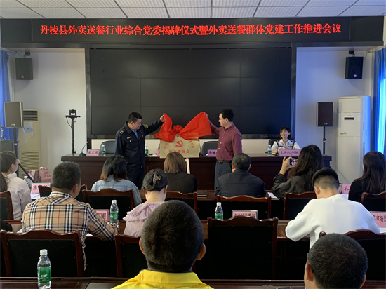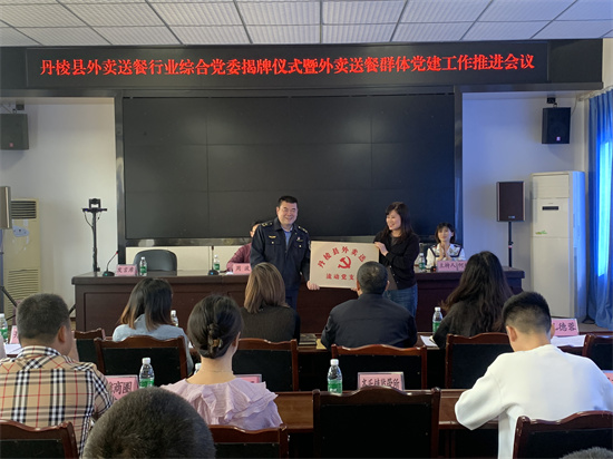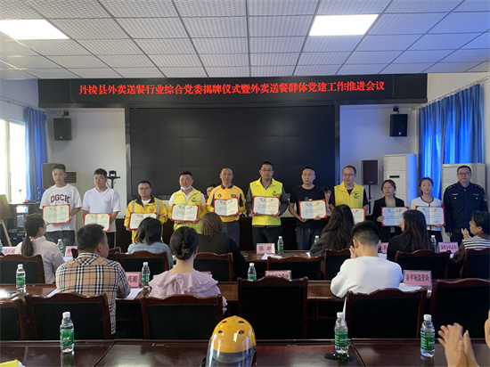 会议宣读了《中共丹棱县委组织部关于同意成立中国共产党丹棱县外卖送餐行业综合委员会的批复》《关于成立丹棱县外卖送餐流动党支部的批复》文件。与会领导为丹棱县外卖送餐行业综合党委揭牌,为丹棱县外卖送餐流动党支部授牌,并对10名外卖送餐员代表颁发“食品安全监督员”聘书。