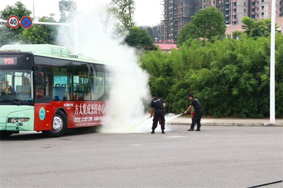 在火灾事故及反恐防暴模拟场景中,两名安保队员在公交车停放场地巡逻时,发现1名青年男子将燃烧瓶(烟雾弹)点燃扔向停放的公交车,同时手持匕首对安保队员发起袭击,一名安保队员手持藤棍与男子周旋,另一名安保队员立即向指挥中心报告,并拿起附近的灭火器进行扑救。指挥中心接报后,立即启动《反恐防暴应急预案》《消防事故应急预案》,组织相关部门赶赴现场处置,并拨打110报警电话及119消防救援电话,随后物业其他巡逻队员携带警用器材赶到现场联手将该男子制服。几分钟后,消防员赶到现场扑灭火情,纵火男子也被移交给警方。