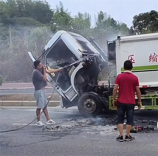 据了解,过往好心司机伍先生同好友出行途中,看到一辆压缩垃圾车自燃,由于同行车辆的灭火器容量不足,便招手拦车向过往车辆借灭火器。此时,一罐车司机回应,将自己车辆的灭火器递给伍先生的好友何先生,何先生快速应急灭火,但火势较大,正在焦急的同时,罐车司机将自己的车辆移至自燃垃圾车辆前方,用罐车内的备用水进行灭火,仅用6分钟,火势得到控制。