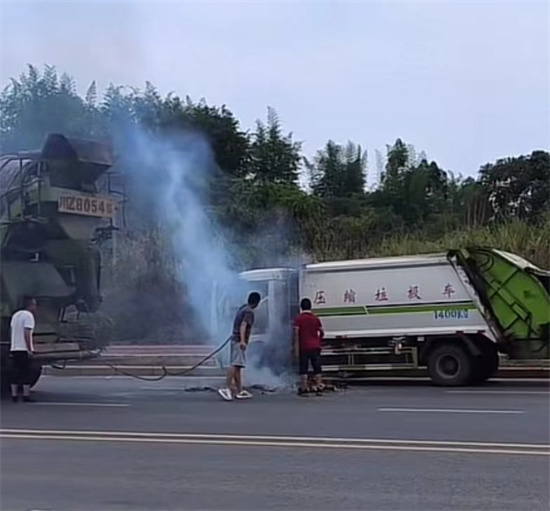 四川新闻网消息(郑佳洁 彭静雅)6月26日13点50分,眉山市东坡区富牛大道南段,一压缩垃圾车辆发生自燃,过往好心司机拦车相助,与罐车司机合力灭火。