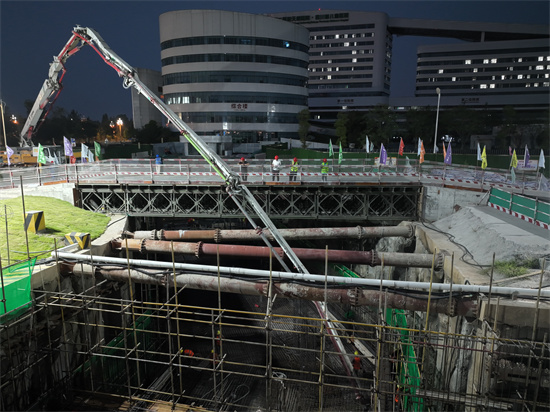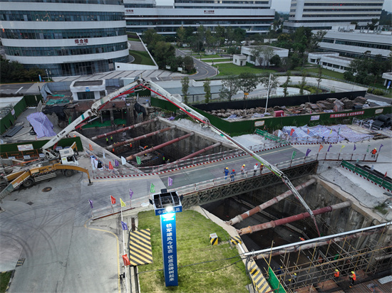 “目前我们正在进行的是最后一块筏板浇筑,预计施工时间为7小时。最后一块筏板浇筑完成后,便标志着我们整个项目全部进入主体施工阶段,为项目高效建设、优质履约按下‘加速键’。”项目负责人介绍道,项目预计9月底完成全部主体施工,明年2月达到验收条件。