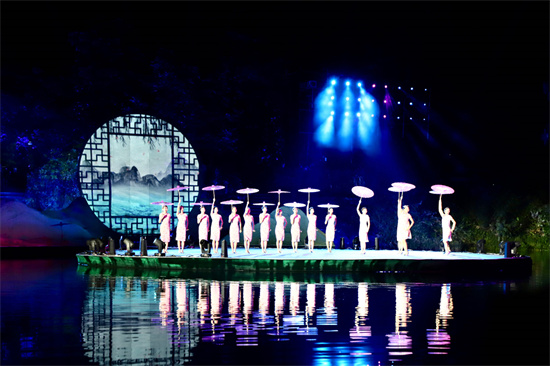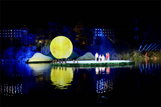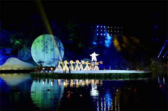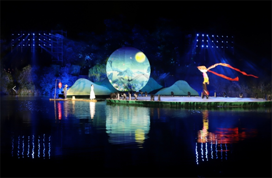 本次活动舞台演出在柳江古镇核心景区杨村河上进行,如梦如幻,唯美至极。演出通过“花溪雅韵”“月照千古”“月耀柳江”“月映万家”四个篇章,以群舞《花溪雅韵》、音舞诗画《东坡问月》、情景舞蹈《遥夜相思》、杂技《千年风骨》、情景展示《马铃声声》、非遗展示《四海清辉》、舞蹈《瑶台花容》、特技展示《水月流光》、歌伴舞《如愿》等歌舞表演再现民俗、歌颂美好、致敬佳节。