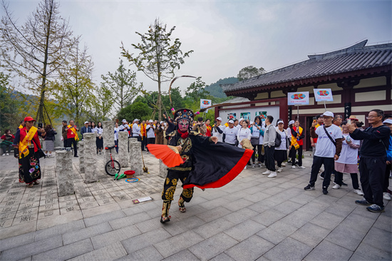 启动仪式后,登山活动正式开始,只见两个“彭祖祖”人偶手举会旗作指引,带领数百名参会嘉宾、彭祖文化研究会会员、市民游客等一同登高体验。挂丝带祈福、摸“福”摸“寿”、古风投壶,彭祖导引术展演、糖画制作、国粹茶艺表演……登高路上,大家一边参与游戏互动,一边欣赏精彩表演。