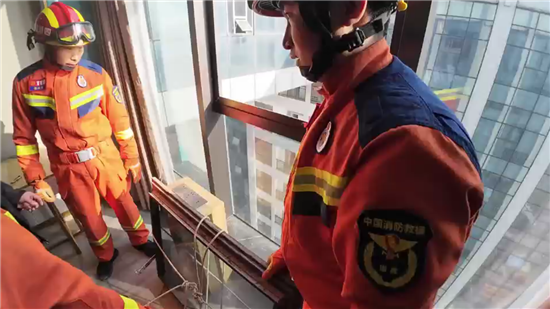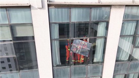 1月2日14时39分,救援力量到达现场后,经查看,发现整扇窗户已脱落,同时向在场群众了解基本情况。“由于情况紧急,下面还有很多群众,我就跟其他同事采取相关措施合力将其捆住,并用钢管支撑,然后腾出手赶紧给你们打电话,请你们来紧急救援。”报警大姐说道。随后,带队指挥员迅速制定营救方案,一边做好楼下区域警戒,一边利用绳索将玻璃暂时固定。由于玻璃较重且不好操作,消防救援人员利用模板及钢管反复尝试,15分钟后,玻璃被成功取下。