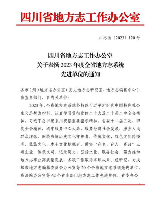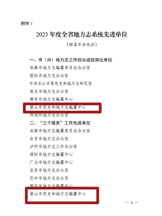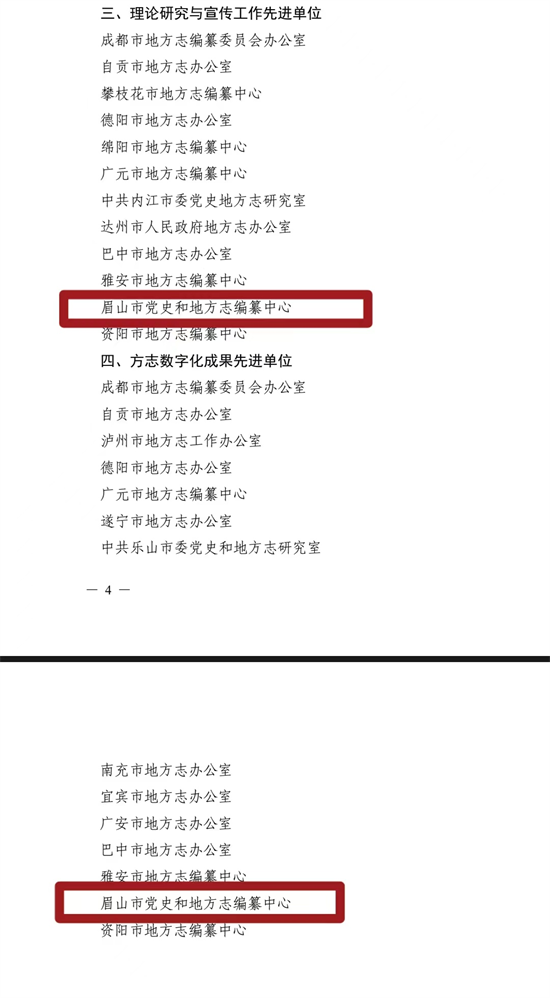 四川新闻网消息 近日,四川省地方志工作办公室印发《关于表扬2023年度全省地方志系统先进单位的通知》(以下简称《通知》),对全省20个地方志系统先进单位予以表扬。眉山市党史和地方志编纂中心荣获“市(州)地方志工作综合成效突出单位”“‘三个服务’工作先进单位”“理论研究与宣传工作先进单位”“方志数字化成果先进单位”4项表彰。