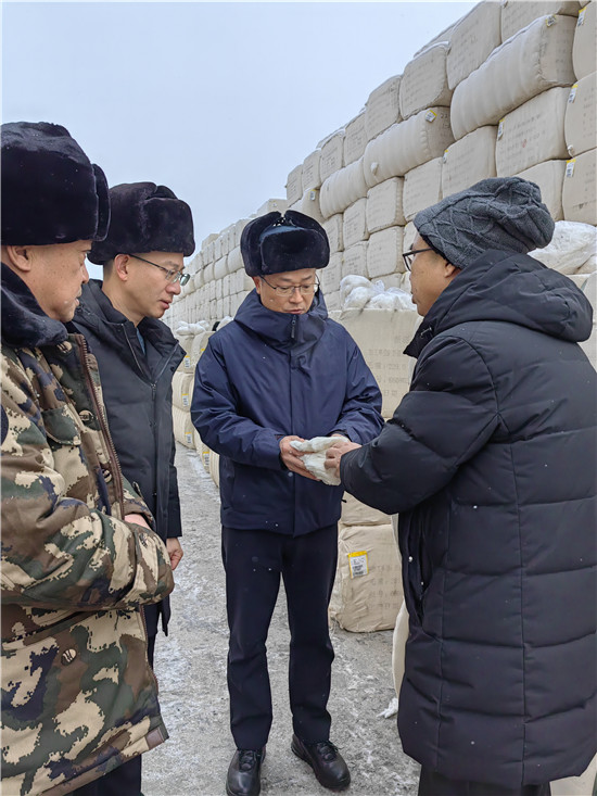 袁利民一行冒着零下近20度的严寒,深入新疆伊犁州陆德棉麻有限责任公司、新疆农资(集团)有限责任公司奎屯储运分公司和奎屯实验室,看望慰问眉山纤检所在疆棉花公检人员,为他们送去市局党组的关心关怀。袁利民一行实地调研了棉花过磅、扫码测水、杂质样品抽取、样品交接、含杂率检测等公检流程,对公检人员不惧严寒、敬业尽责的精神给予高度赞扬。