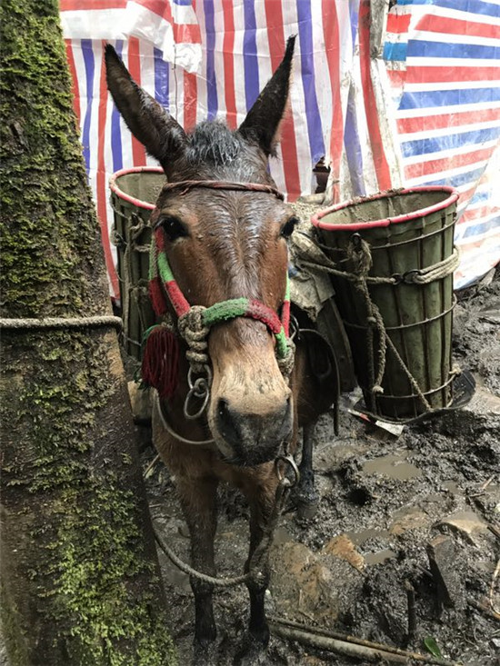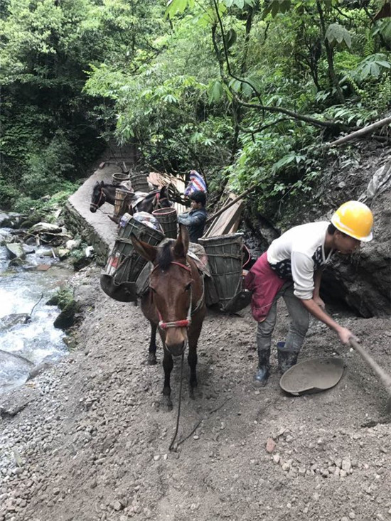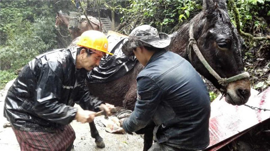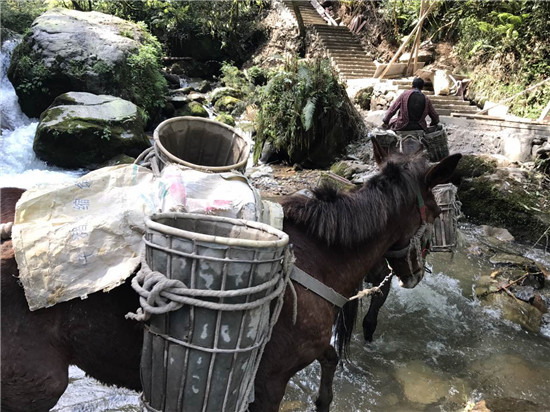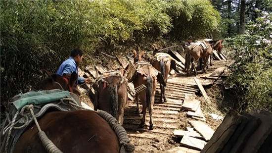 “现在路没修好 ,一头骡子一次只能驮两大块石板, 路修好了的话, 一头骡子能驮十块 ,一天也能跑上十几个来回。”赶骡人代忠明接着话茬说,“骡子干一天下来也很辛苦,我们都把它们当宝贝一样‘伺候’,生怕伤着、饿着。”