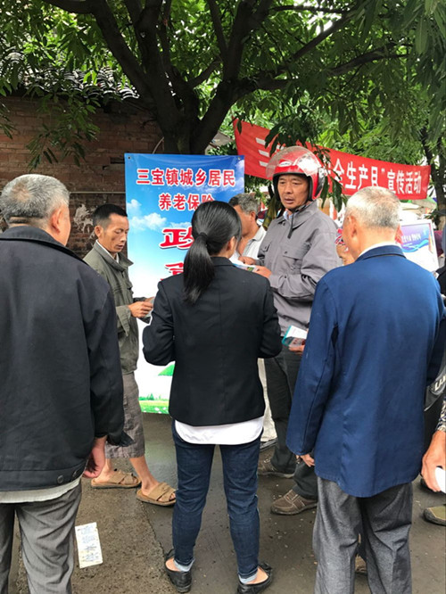 四川新闻网眉山6月15日讯(张小洪 文/图)为进一步推进城乡居民养老保险工作,提高群众对养老保险的知晓率和参保率,根据上级要求,6月15日上午,洪雅县三宝镇劳动保障所工作人员走上街头,向群众大力宣传养老保险政策。